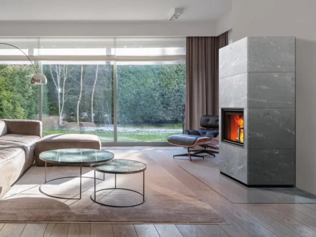 Le modèle Mella se distingue par sa largeur imposante (900 mm) et son design contemporain muni d’une large porte vitrée horizontale, qui offre une vision panoramique du feu. Conçu pour les intérieurs spacieux ou les pièces à fort volume, il associe l’élégance de la pierre ollaire à une performance thermique robuste.